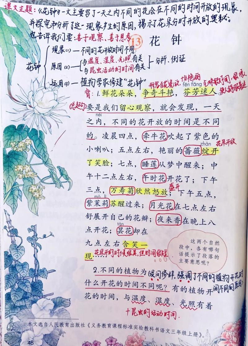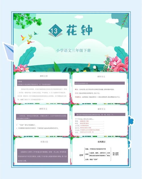 《花钟》这篇课文是按照时间顺序来写的,展现了花儿开放的不同时间段。这篇课文是小学三年级语文上册的一部分,旨在让学生通过学习,了解花儿开放的时间差异。《花钟》是统编版语文三年级下册第13课的课文,属于精读课文,由梓君朗读。课文首先归纳了一个现象:不同的花儿在一天之内开放的时间各不相同。