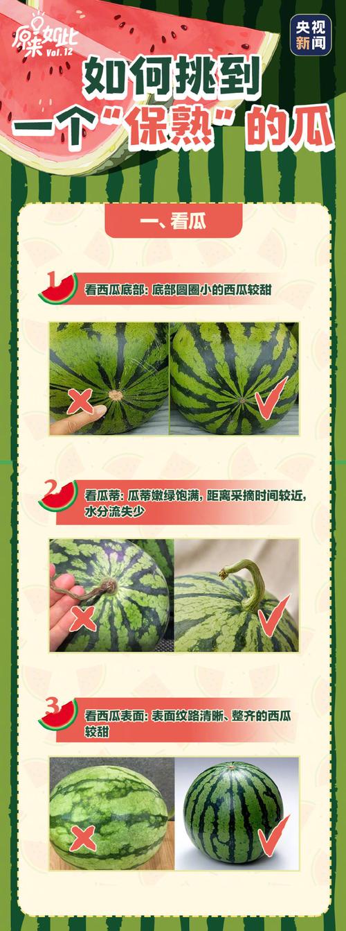判断西瓜是否成熟,记住这5个一看就会的技巧:有经验的瓜农常说「熟瓜有熟相」,成熟西瓜通常花纹清晰、间距变宽。瓜蒂周围会微微凹陷,表皮触感粗糙但坚硬,拍打时发出低沉的「嘭嘭」声。这几个直观特征组合判断,准确度能超过80%。