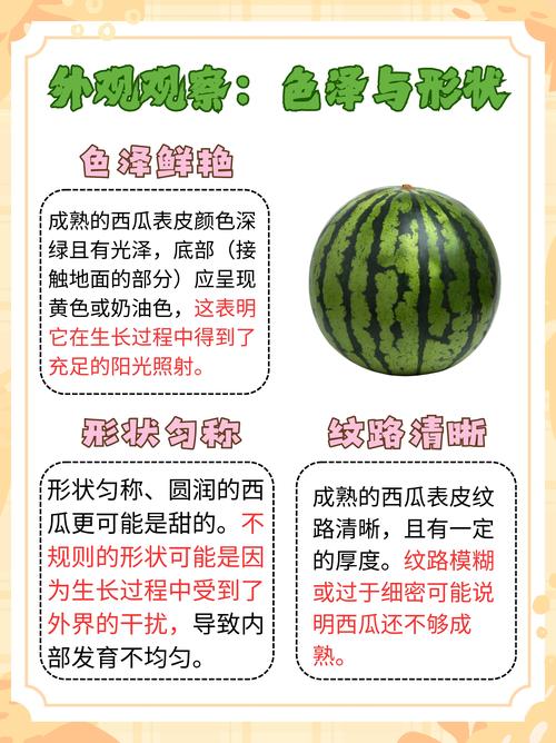 1、辨别西瓜是否成熟只需掌握五种观察技巧。理解了挑选的基本需求,咱们看看具体方法。瓜皮花纹若呈现墨绿与浅绿鲜明对比,纹路舒展无断裂感,通常成熟度高。瓜底接触土壤的黄***域越明显,范围大且色泽偏暗,说明生长时间充足。