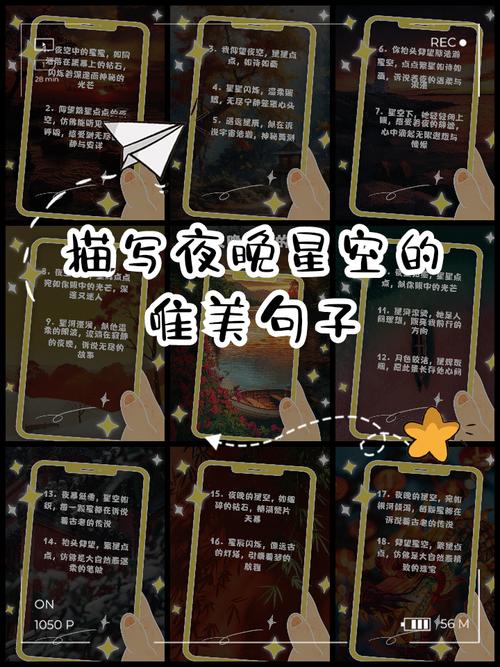 5、以下是一些描写星空的唯美短句,这些句子蕴含着与星月共存的温柔意境:星空如织,月光如水,温柔地铺满了夜的画卷。繁星点点,与月同辉,每一颗都在诉说着无尽的温柔。在星河的尽头,月光轻抚,那是世间最温柔的角落。夜幕低垂,星光与月光交织,绘就一幅温柔的梦境。