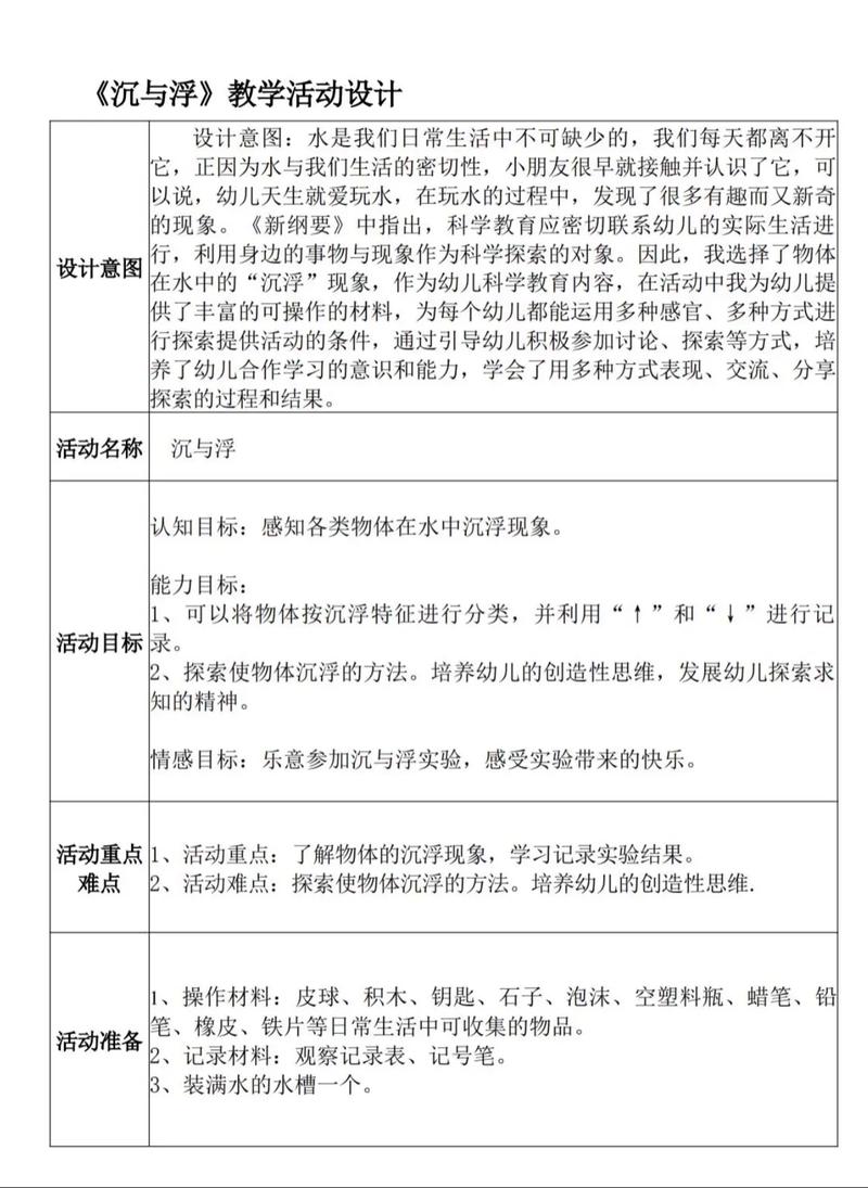 幼儿园中班科学领域《沉与浮》教案(1)活动目标:探索物体的“沉”与“浮”,并了解改变其状态的方法。乐于参与科学实验,培养科学探索的兴趣。环境创设:准备大盆装水。提供纸和笔。准备熟鸡蛋、盐水、清水。活动过程:收集3种不同物品,引导幼儿试水,并记录观察结果。