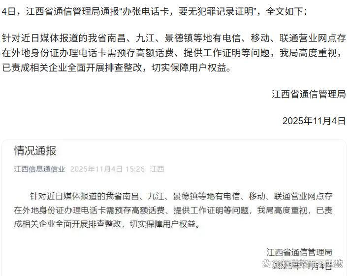 11月4日,江西省通信管理局针对媒体报道的“多地办电话卡需工作证明、无犯罪证明、银行流水等”问题,公开发布通报。