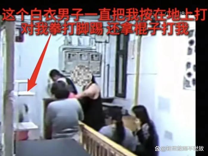 80多岁的老头率先冲出房门,猛推敲门女孩并高声反咬“你不要推我”;三名家人紧随其后用上海话辱骂;醉酒男子从楼下冲上来直接掐衣领;高大中年男子将女孩推到监控盲区殴打;棍子、拳头、脚踢相继落在女孩身上。