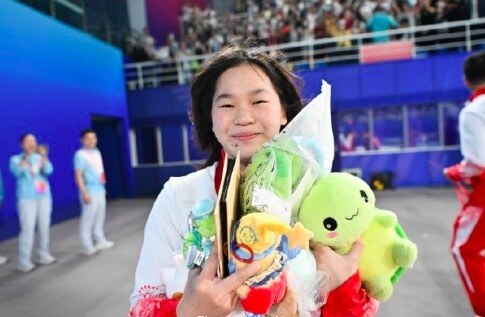 11月2日,第15届全运会跳水比赛,全红婵伤愈首秀,和王伟莹搭档拿下双人10米跳台第一,助力广东队斩获跳水女子团体冠军,摄影师现场第一视角贴脸拍全红婵夺冠领奖。