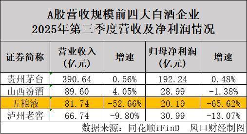 10月30日晚,五粮液发布2025年三季报。数据显示,前三季度公司实现营业收入609.45亿元,同比下降10.26%;归母净利润为215.11亿元,同比下降13.72%。第三季度单季,五粮液业绩遭遇断崖式下滑:营业收入同比下降52.66%至81.74亿元,归母净利润同比下降65.62%至20.19亿元。