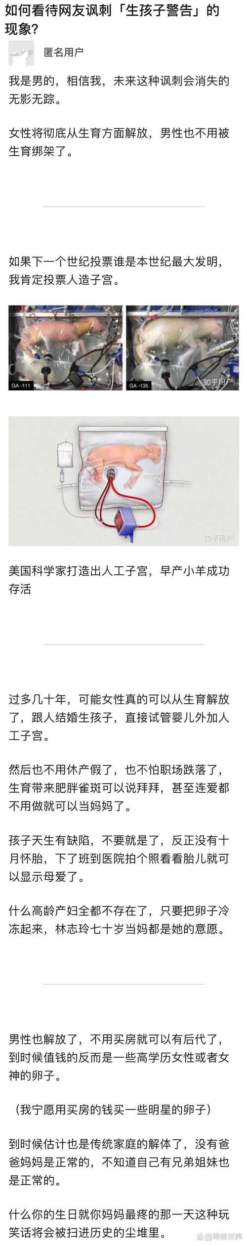 2、当代社会,女性生育意愿低,但生孩子警告却甚嚣尘上,形成了一道奇特景观。上文讨论了两性筹码的问题,却未涉及生育议题。评论区一位知友(或疑似男性)提出,生育被视为女性筹码,用以换取男性物质保障。我们应明确,生孩子警告不应是女性筹码,因为时代已经改变。