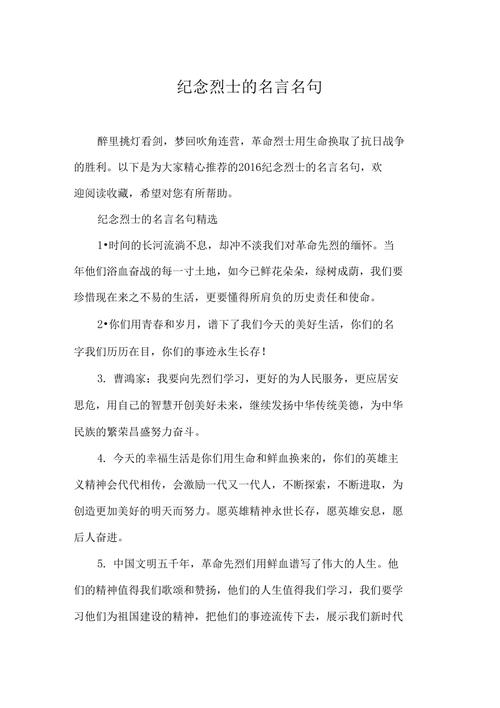 关于烈士名著中的名言,以下是几个经典的例子:“长太息以掩涕兮,哀民生之多艰。”这句话出自屈原的名著,表达了烈士对人民苦难生活的深切同情和哀伤,让人感受到他们忧国忧民的情怀。“先天下之忧而忧,后天下之乐而乐。