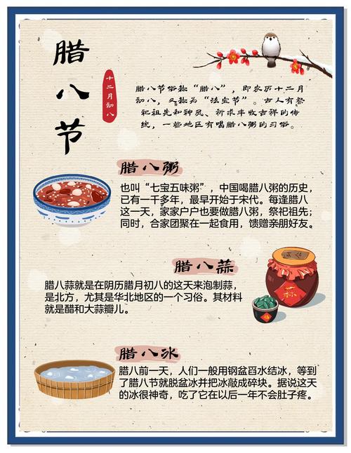 2、喝腊八粥的时间:腊八粥作为一种传统的美食,是在农历十二月初八,即腊八节这一天食用的。这一天,中国民间有着喝腊八粥的风俗,用以庆祝丰收,并流传至今。腊八粥的食用习惯:早上食用:在一些地方,喝腊八粥有着不过午的禁忌。这意味着腊八粥通常在腊八节的早上食用。