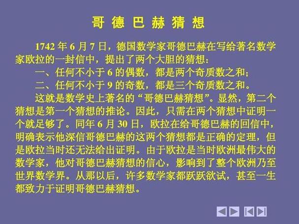 公元1742年6月7日哥德巴赫(Goldbach)写信给当时的大数学家欧拉(Euler),提出了以下的猜想:(a) 任何一个=6之偶数,都可以表示成两个奇质数之和。(b) 任何一个=9之奇数,都可以表示成三个奇质数之和。从此,这道著名的数学难题引起了世界上成千上万数学家的注意。200年过去了,没有人证明它。