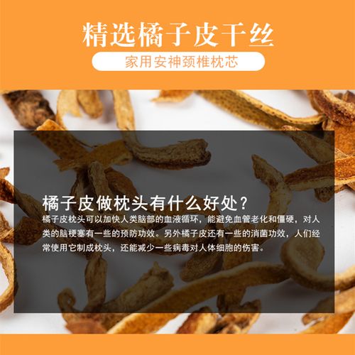 好处: 治疗相关病症:晾干后的橘子皮做成的橘皮枕,对于治疗高血压病、失眠等有一定的辅助作用。在制作时,还可以加入银花、菊花、玫瑰花、灯芯草等,以增强其保健效果。 安神镇静:橘子皮有一股特殊的清新香味,这种香味有助于安神镇静,从而有助于改善睡眠质量。