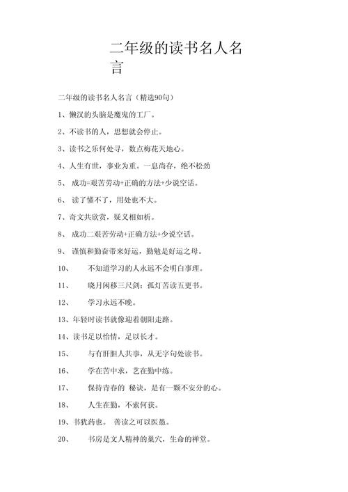 3、小学二年级的励志名言如下:读一书,增一智。知识是智慧的火炬。造烛求明,读书求理。读书使人成为完善的人。良好的习惯是成功的保证。积累知识,胜过积蓄金银。天行健,君子以自强不息。逆境是磨练人的最高学府。少壮不努力,老大徒伤悲。不吃饭则饥,不读书则愚。