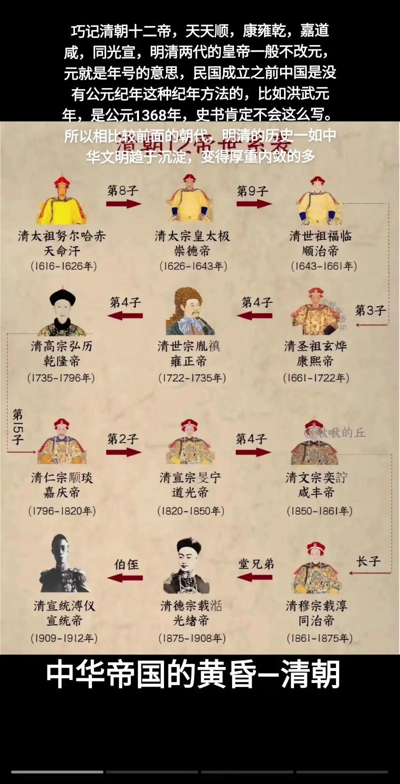 6、清朝共12个皇帝,清太祖努尔哈赤(追尊)、清太宗皇太极、清世祖顺治、清圣祖康熙、清世宗雍正、清高宗乾隆、清仁宗嘉庆、清宣宗道光、清文宗咸丰、清穆宗同治、清德宗光绪 、宣统帝溥仪。