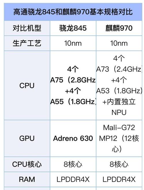 麒麟970处理器的性能相当于骁龙845。以下是两者在具体方面的对比:CPU核心方面:麒麟970和骁龙845都采用了4大核+4小核的设计,但架构和主频有所不同。骁龙845采用基于ARM A75/A55的大小核心设计,最高主频能达到8GHz。麒麟970则采用ARM的A73和A53来设计大小核心,最高主频为4GHz。