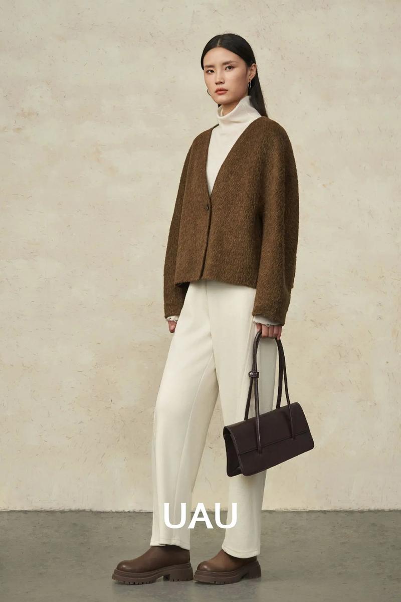 搭配思路:选择一条高腰设计的长裤,如黑色或深灰色直筒裤,能够有效拉长腿部线条,显得更加修长。卡其色上衣与深色下装形成鲜明对比,既显瘦又时尚。特点:这种搭配简洁大方,适合日常通勤和休闲场合,展现出干练的气质。卡其色羊绒衫+锥形裤 搭配思路:锥形裤的设计能够很好地修饰腿型,尤其是对于小腿较粗的人来说,可以起到显瘦的效果。