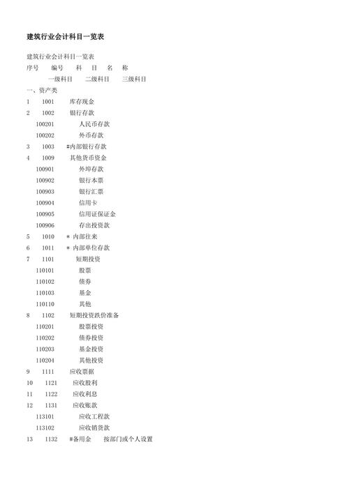 6、在酒店行业中,合理的会计科目设置对于财务管理至关重要。以下是一些常见的资产类会计科目: 现金与银行存款:分别设置1001和1002科目,用于记录日常运营中的现金和银行存款。借贷双方均需按币种分类。 其他应收款:包括备用金(113301),员工暂借款(113302)等,其中备用金需按债务人设置二级明细。