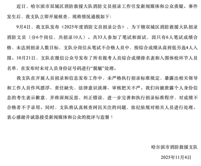 笔试不及格仍进体检名单 官方通报 违规操作引争议!11月4日晚,哈尔滨市消防救援支队发布情况通报,针对双城区消防救援大队消防文员招录工作引发的质疑进行了回应。9月4日,该支队发布了《2025年度消防文员招录公告》,计划为双城区消防救援大队招录10名消防文员,共33人参加了笔试和面试。由于只有6人笔试成绩合格,未达到招录人数目标,支队从笔试不合格人员中按综合成绩从高到低另选4人入围。10月21日,支队在微信公众号上公布了所有报考人员的综合成绩排名表和入围体检环节人员名单,但未对身份证号码进行脱敏处理。