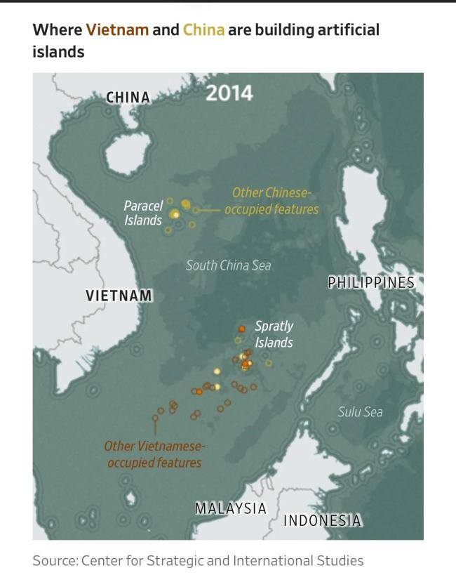 卫星图像显示,越南在斯普拉特利群(Spratlys,中国称南沙群岛,原文)其占据的所有21块岩石和所谓的低潮高地(low-tide elevations,即高潮时淹没在水下的礁石,原文)上均填海造陆。相比之下,中国在该群岛填海造陆的人工岛屿仅有7个。