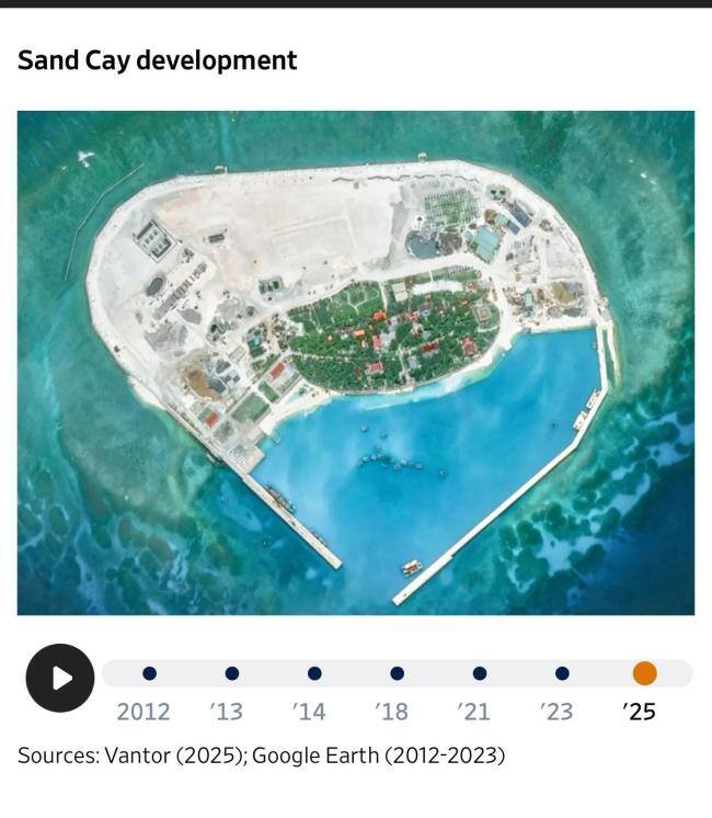 据《华尔街日报》查阅的卫星图像以及研究南海问题的分析人士称,这些新岛屿由海底的沙子、珊瑚和岩石建造而成,如今拥有多个港口、一条2英里长的飞机跑道以容纳大型军用飞机、充足的弹药库,以及可容纳重型武器的防御战壕。