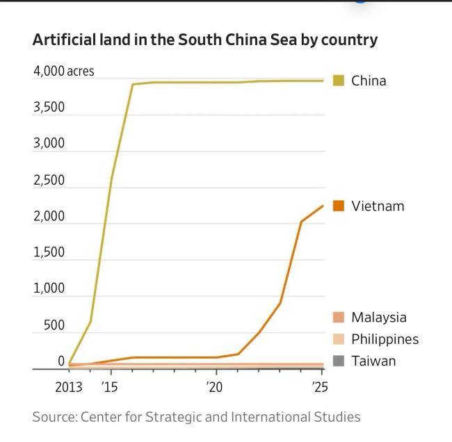 据华盛顿国际战略研究中心(CSIS)称,截至今年3月,越南已在南海填海造地2200多英亩,而中国填海造地面积略低于4000英亩。