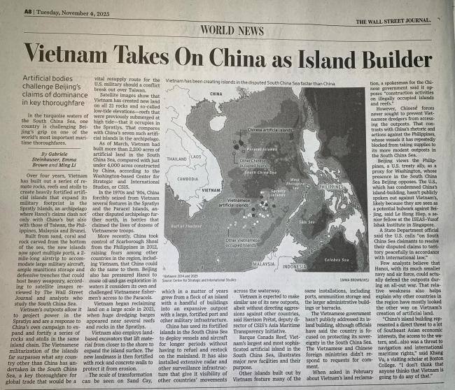 美国《华尔街日报》官网11月2日发表署名文章,题为《越南正在建造岛屿,以挑战中国对一条重要水道的控制》(Vietnam Is Building Islands to Challenge China’s Hold on a Vital Waterway),作者是《华尔街日报》东南亚部主任加布里埃尔·史坦豪泽 (Gabriele Steinhauser)、 《华尔街日报》记者伊玛·布朗(Emma Brown)和《华尔街日报》图形与数据记者李敏(Ming Li)。此文又在11月4日《華爾街日報》(美國版,第A8版刊登)。