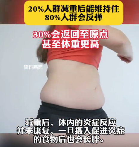 据陕视新闻,减肥成功后站在体重秤上,数字却悄悄回升,这种崩溃感堪比刚中彩票就弄丢奖券!专家表示,大约20%左右人群在减重后能够真正维持住自己的体重,80%的人群会反弹,其中30%会返回至原点,甚至体重更高。