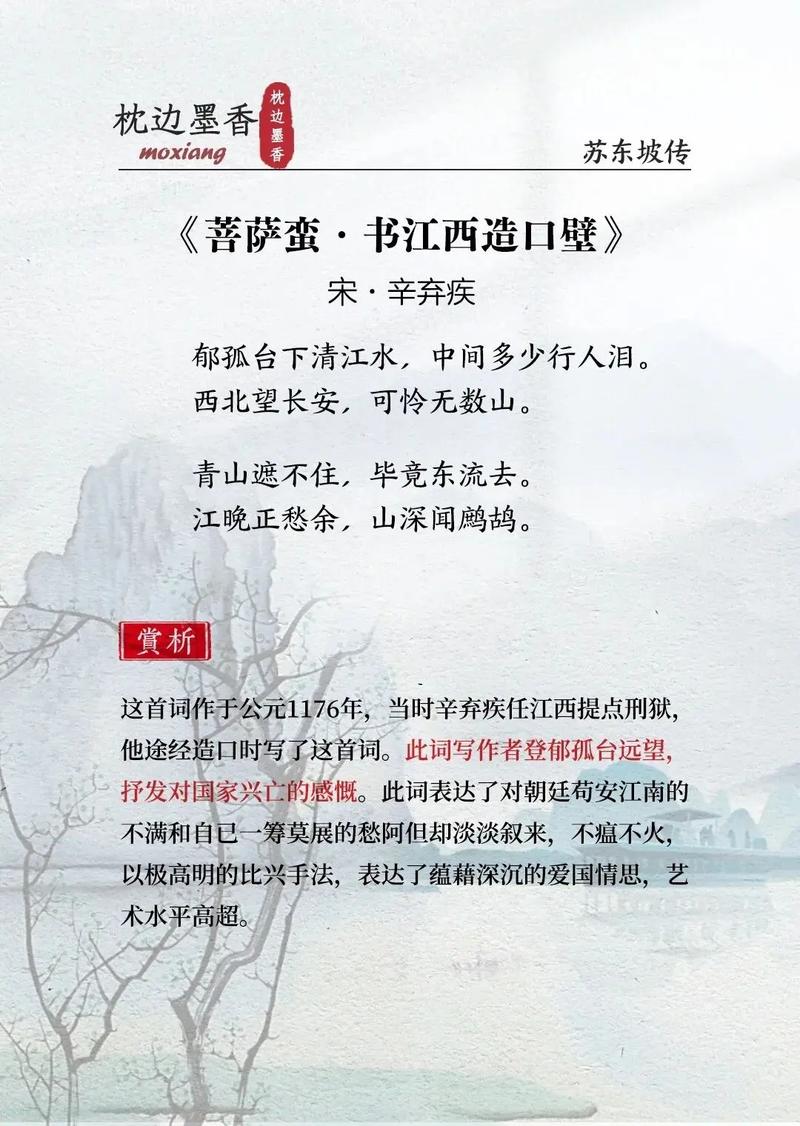 菩萨蛮:本唐教坊曲,后用为词牌,也用作曲牌。造口:一名皂口,在江西万安县南六十里。《菩萨蛮·书江西造口壁》译文:郁孤台下这赣江的水,水中有多少内行人的眼泪。我举容头眺望西北的长安,可惜只看到无数青山。但青山怎能把江水挡住,江水毕竟还会向东流去。