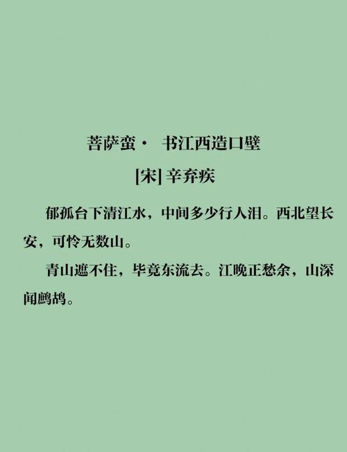 3、《菩萨蛮·书江西造口壁》的创作背景如下:时间与地点 时间:这首词创作于公元1176年,即南宋孝宗淳熙三年。此时,辛弃疾已经南归十余年,经历了仕途的起伏与国家的动荡。地点:辛弃疾在江西担任刑法狱颂方面的官吏,其职责使他经常需要在湖南、江西等地巡回往复。