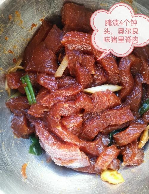 3、肉的处理:选择新鲜的猪里脊肉,去除多余的脂肪和筋膜,然后将肉切成长条状,厚度大约0.5厘米左右。腌制:将切好的肉条放入大碗中,加入生抽、老抽、料酒、白糖、孜然粉、辣椒粉、花椒粉、蒜末、姜末,搅拌均匀后,盖上保鲜膜,放入冰箱冷藏腌制至少4小时,最好过夜,这样肉质更入味。