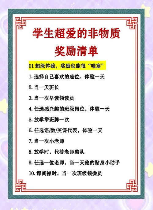4、给学生奖励,以下是一些比较有创意的方式:“当场抓住”机制与好事罐:设立“当场抓住”机制,表彰表现优秀的学生,并将其名字和好事放入“好事罐”中,每周抽取几个名字作为奖励对象。
