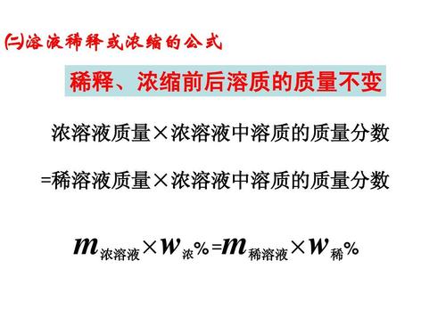 稀释溶液的基本方法是向溶液中加入水,而在这个过程中,溶质的质量保持不变,这是进行溶液稀释计算的基础。 需要注意的是,当溶液已经是饱和状态时,增加溶质不会改变溶质的质量分数。