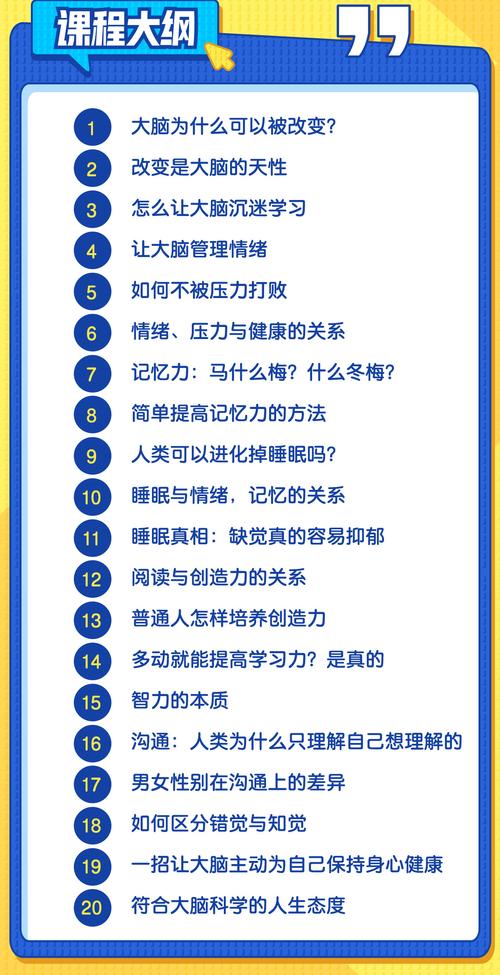 6、科学用脑的五要素包括:动静结合:劳逸结合是科学用脑的关键,需要合理安排用脑时间,避免长时间紧张工作导致大脑过度疲劳,适时的休息和放松对于保持大脑的有效工作至关重要。课程/任务交替:通过不同课程或任务的交替进行,可以避免对某一特定领域或任务的过度集中,有助于大脑保持新鲜感和高效运转。