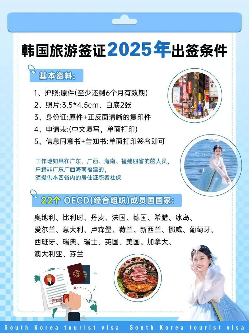 5、办理韩国旅游签证的基本条件包括:持有有效期超过6个月的护照、填写完整的签证申请表、近期白底彩色证件照(5*5cm)、身份证及户口本彩色复印件,且需通过指定送签社代理递交材料。详细材料与注意事项护照要求护照需在行程结束后仍有至少6个月有效期,并有至少2页空白页。
