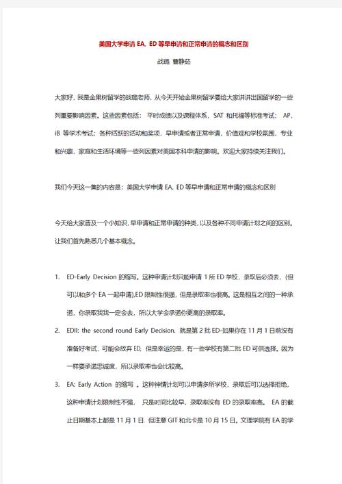3、ED是Early Decision的缩写,代表提前决定录取。这种申请方式要求申请者只能向一所学校提交申请,并且如果被录取,必须接受录取并撤销其他学校的申请。ED的截止日期通常在11月初,录取结果则在12月底至1月初公布。 EA,即Early Action,指的是早行动申请。