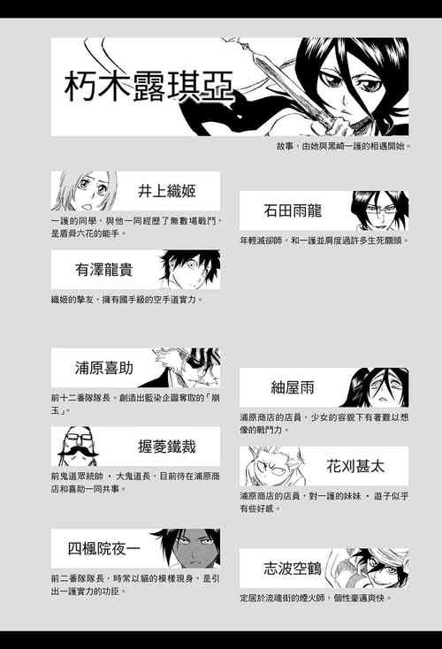 《死神之无双》,作者是无双小飞羽。《死神之啡白物语》,作者是ifwy。《死神凰火》,作者是BLEACH。《寂寞双娑罗》,作者是卜卦离魂。《死神云端之上》,作者是一枝灯影。《死神莫失莫忘》,作者是罗小七。《死神十里香雪》,作者是鹓凰。