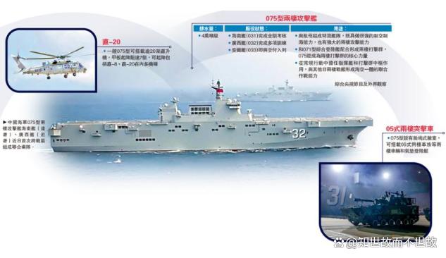 同时,075型两攻可以与航空母舰组成“特混舰队”,从而兼具强大的制空、制海、两栖攻击战力。075型两攻还能与071型船坞登陆舰编队,形成直升机、气垫登陆艇、两栖坦克和战车等大规模登陸作战体系。