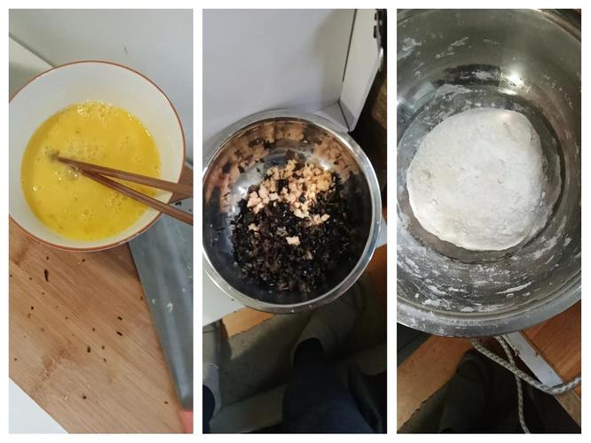 3、处理韭菜:韭菜切末后,先加15ml香油拌匀,形成油膜防出水。切记:韭菜拌馅前不能加盐! 炒鸡蛋:鸡蛋加2g盐打散,热锅凉油(油稍多),中火炒至嫩滑碎块,关火晾凉。秘诀:用筷子快速划圈搅拌,自然形成小碎块,省去切蛋步骤。
