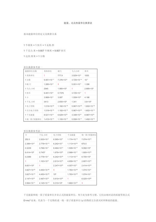 千瓦·时(kW·h)等于3600000焦耳(J),这是指一个功率为1千瓦的设备在运行1小时后所消耗的能量。1千卡等于1大卡,而1卡等于187焦耳,因此1千卡就等于187千焦耳(kJ)。1焦耳/秒等于1瓦特,这是功率的单位。能量的单位是焦耳,其中1焦耳等于1牛顿·米,也等于1瓦特·秒。