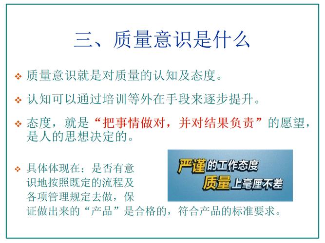 质量意识是指企业对产品质量重要性的认知,以及在日常工作中对质量把控的自觉性和关注度。以下是关于质量意识的详细解释:质量意识的内涵 质量意识是企业员工对产品质量的认识和重视程度,这种意识应贯穿于企业的各个层级和部门。