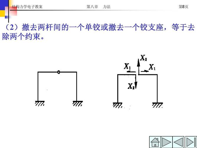 静定结构的受力分析方法依赖于静力平衡,通常通过隔离体的截面法来建立平衡方程,寻找反力和内力。为简化求解,应确保每个方程只涉及一个未知力,以避免联立方程的复杂性。对于对称结构,其力学特性具有明显的对称性,这在静定和超静定结构的分析中都适用。