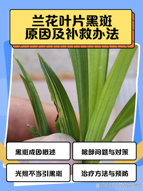2、兰花叶片黑斑原因及补救办法兰花叶片出现黑斑的原因可能包括:浇水过多、光照不足、施肥不当、病虫害侵袭等。补救办法包括:调整浇水频率,避免过度浇水,使盆土保持湿润即可。
