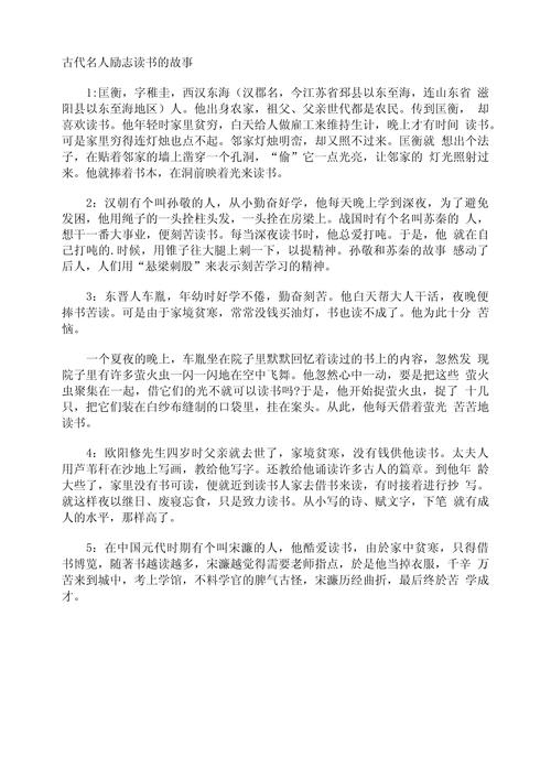 断齑划粥”的故事。悬梁刺股 孙敬悬梁汉朝的孙敬,人称“闭户先生”,常常独自关门读书。有时其实太累,为了防止打瞌睡,他用一根绳子,一头系在梁上,一头结着头发,让头颈正直地吊住。这样,若是打瞌睡,就会扯痛头发,立刻惊醒。于是,后人用“悬梁刺股”来形容勤学好读的精神。