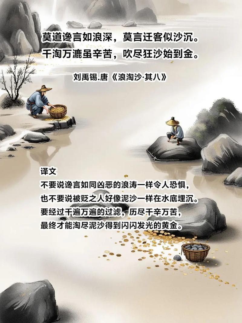 全诗是:莫道谗言如浪深,莫言迁客如沙沉。千淘万漉虽辛苦,吹尽黄沙始到金。“ 千淘万漉虽辛苦,吹尽黄沙始到金”。意思是:沙里淘金,只有经过成千上万次的筛选、过滤,经过风吹雨淋、霜打雪压,经历千辛万苦,吹尽泥沙之后,才会出现黄 灿灿的金子。
