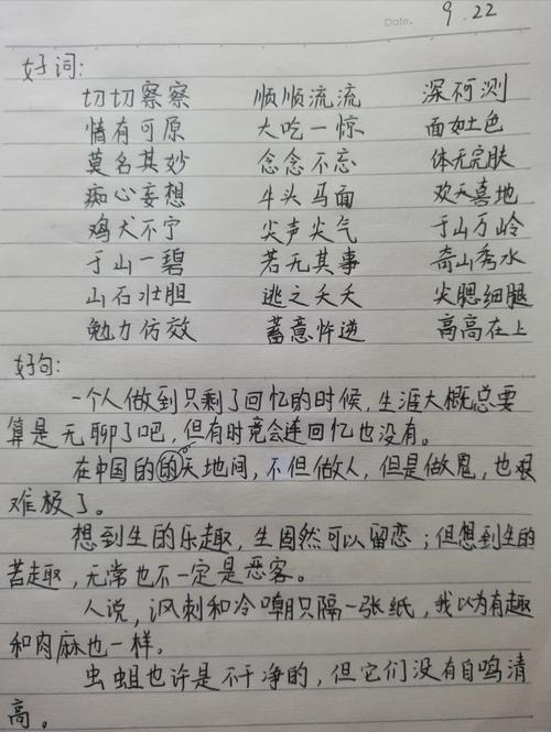 1、好词:落第、不逊、诘责、托词、绯红、标致、油光可鉴、抑扬顿挫、深恶痛疾。迫害、遭遇、妥协、悼念、容光焕发、筹集川资、坚执、淡薄。好句:人生就像一座山,重要的不是它的高低,而在于灵秀;人生就像一场雨,重要的不是它的大小,而在于及时。我疑心他是***因为他是凫水的好手,不容易淹死的。