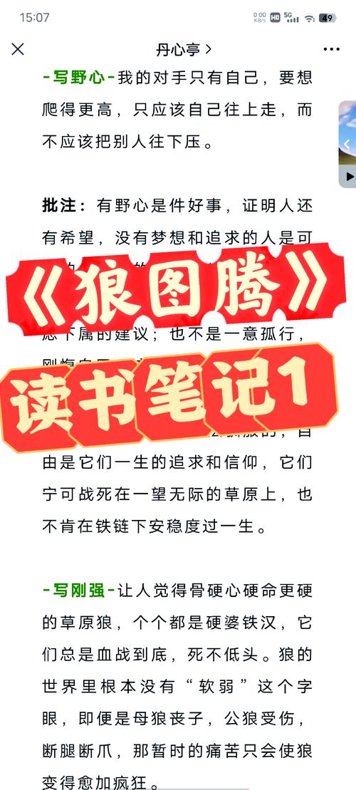 《狼图腾》的深刻含义是探讨人与自然、文明与野性之间的关系,以及对人性、生存法则和生命力的深刻反思。对人与自然关系的反思 姜戎在《狼图腾》中通过对狼的描绘,展现了人与自然的微妙关系。狼作为自然的一部分,具有强大的生命力和野性之美。