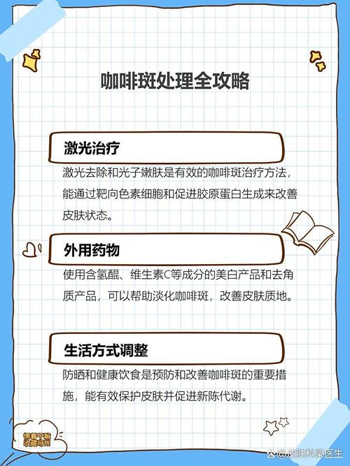 3、咖啡斑是一种色素型胎记,通常表现为皮肤上的浅棕色至深棕色斑块。它可以在出生时发现,也可能在出生后几个月逐渐显现,并随着年龄的增长而逐渐增大。虽然咖啡斑通常不会对健康造成直接影响,但其外观可能会对个人的心理和社交产生一定影响。