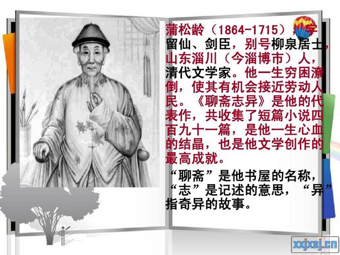 1、蒲松龄(1640~1715)清代小说家,字留仙,一字剑臣,号柳泉居士,淄川(今山东淄博)人。出身于一个逐渐败落的地主家庭,书香世家,但功名不显。父蒲弃学经商,然广读经史,学识渊博。蒲松龄19岁时,以县、府、道三个第一考取秀才,颇有文名,但以后屡试不中。20岁时,与同乡学友王鹿瞻、李希梅、张笃庆等人结“郢中诗社”。后家贫,应邀到李希梅家读书。