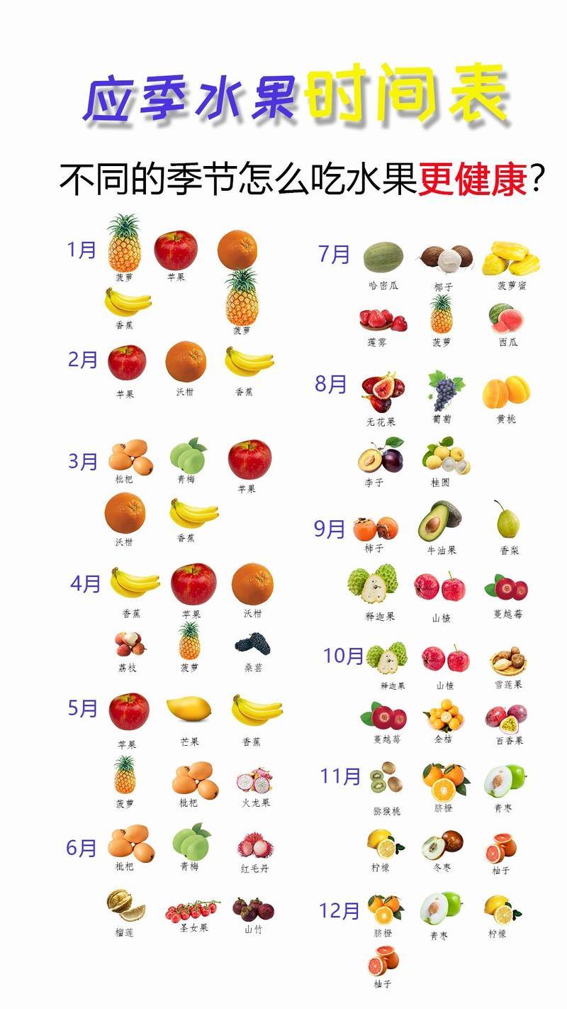3、应季水果时间表(1-12月):1月:此时水果种类相对较少,但可以选择车厘子、甘果等冬季特色水果。2月:继续享受冬季水果,如雪莲果、罗汉果、雪梨、金桔等,这些水果不仅口感独特,还富含多种营养成分。春(3-5月):3月:草莓、桑葚开始上市,樱桃、枇杷也逐渐进入采摘季节。
