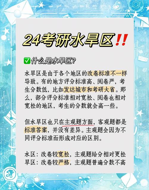 - 水区:北京、上海、天津、江苏、浙江 - 旱区:四川、福建、江西、广西、海南、新疆 在考研过程中,水区与旱区的定义涉及阅卷的宽松程度。水区阅卷相对宽松,旱区则相对严格。例如,同一主观题目,在水区可能获得10分,而在旱区可能只有7分。