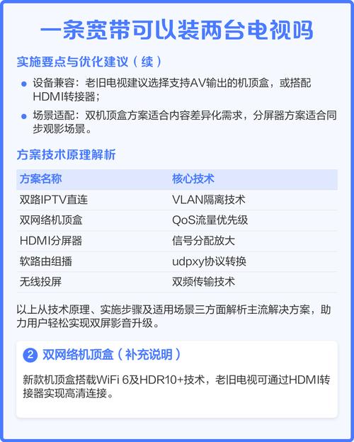 3、是的,电信宽带可以连接两台电视。要实现这一功能,用户可以通过以下几种方式: 使用路由器或交换机:在宽带入户的位置安装一个路由器或交换机,然后从路由器或交换机引出两条网线分别连接到两台电视上。这样,两台电视就可以同时接收到宽带信号了。