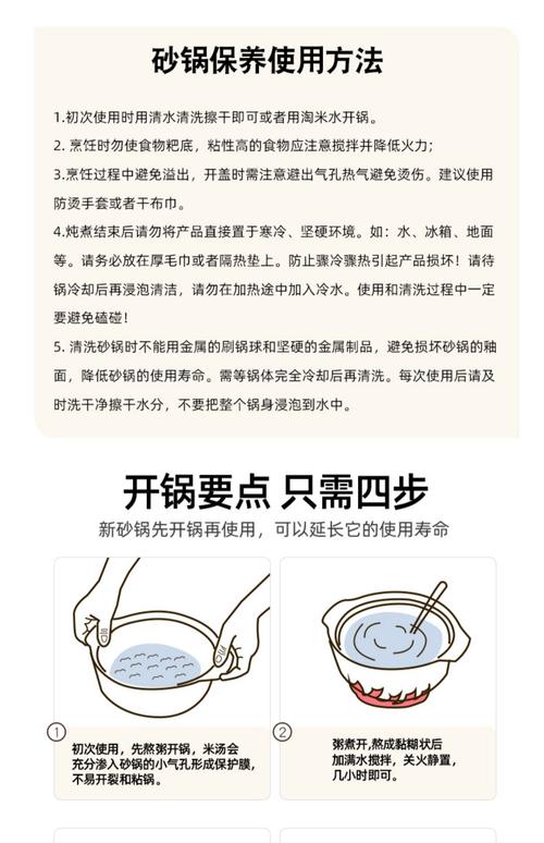 2、.用砂锅熬汤、炖肉时,要先往砂锅里放水,再把砂锅置于火上,先用文火,再用旺火。3.从火上端下砂锅时,要放在干燥的木板或草垫上,切不要放在瓷砖或水泥地面上。4.不要用砂锅熬制粘稠的膏滋食品。